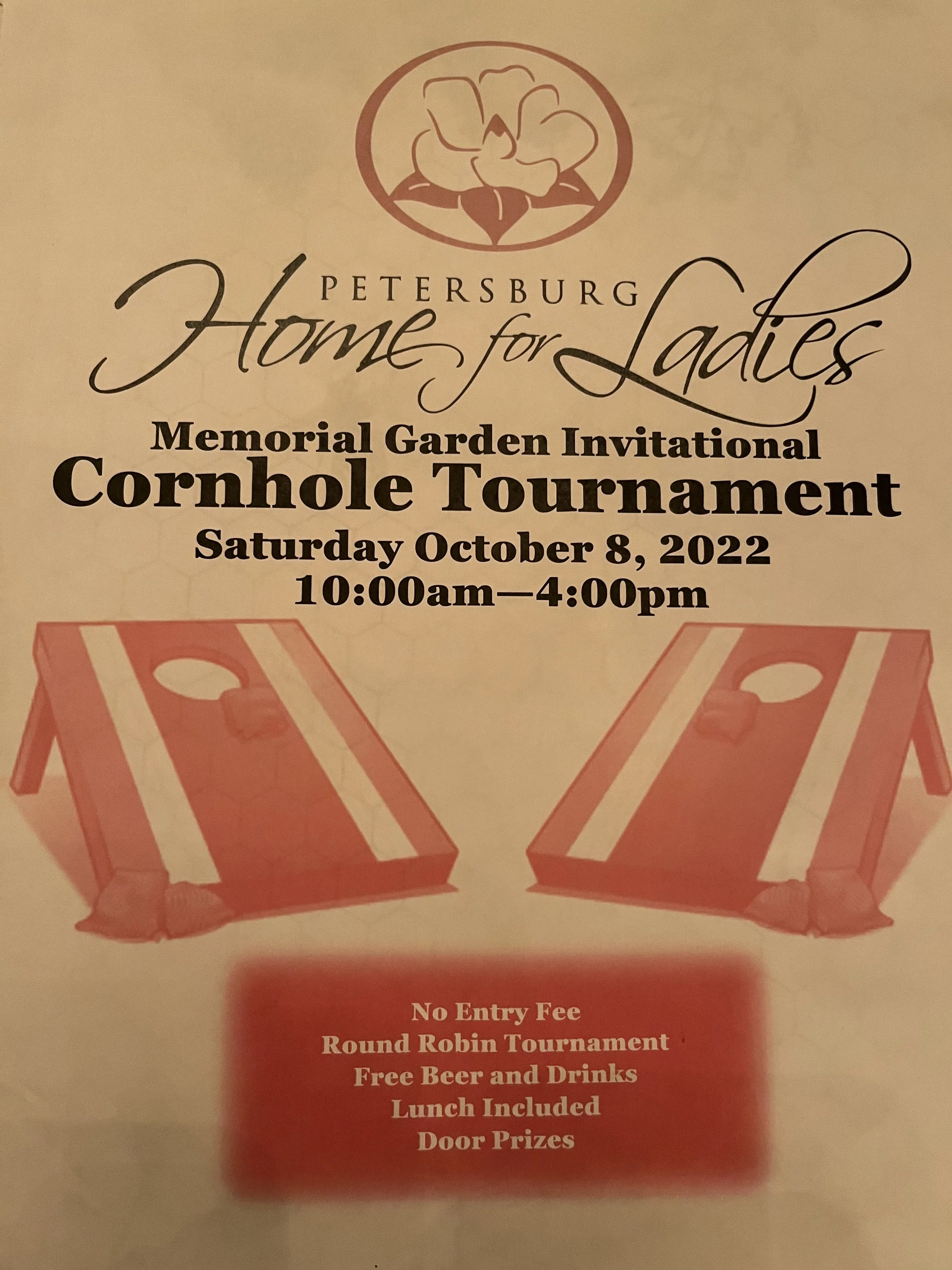Petersburg Home for Ladies is excited to invite you to our Memorial Garden Invitational Cornhole Tournament. You are receiving this email because you are a valued member of our community and we want you to be our guest on October 8, 2022 from 10:00am to 4:00pm.